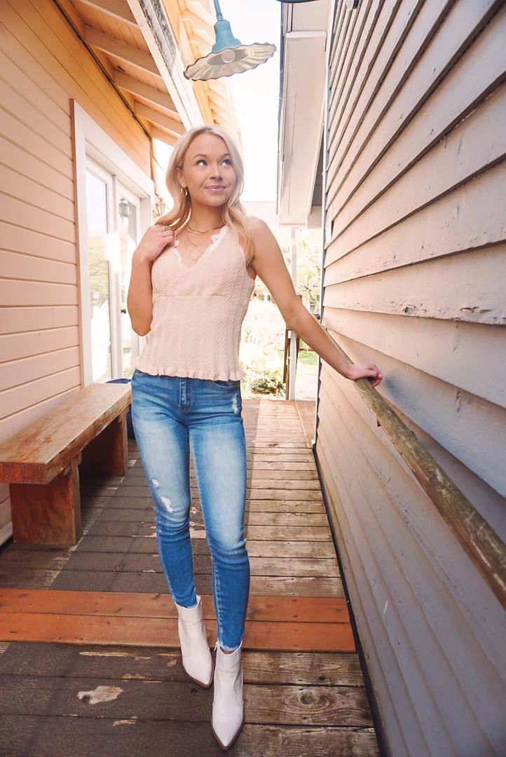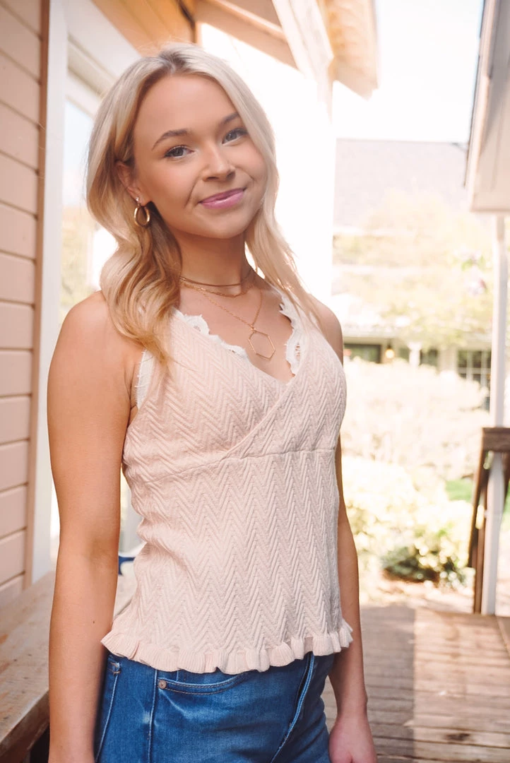Give us all the textures& prints… The Zula tank is a solid, knit cami top featuring a surplice neckline, Chevron knit print, sleeveless style, adjustable cami straps, a ruffled hem, and a relaxed fit. Pair with your fa route bottoms for a unique yet comfortable wear!