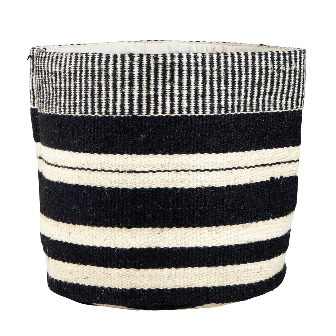 Perfect to hold just about anything from pillows to a potted plant! This 12x 12 jute bag comes in both 12×12 & 6×6 featuring black and ivory stripes in woven style.