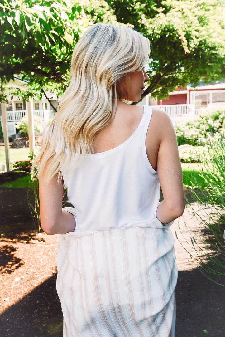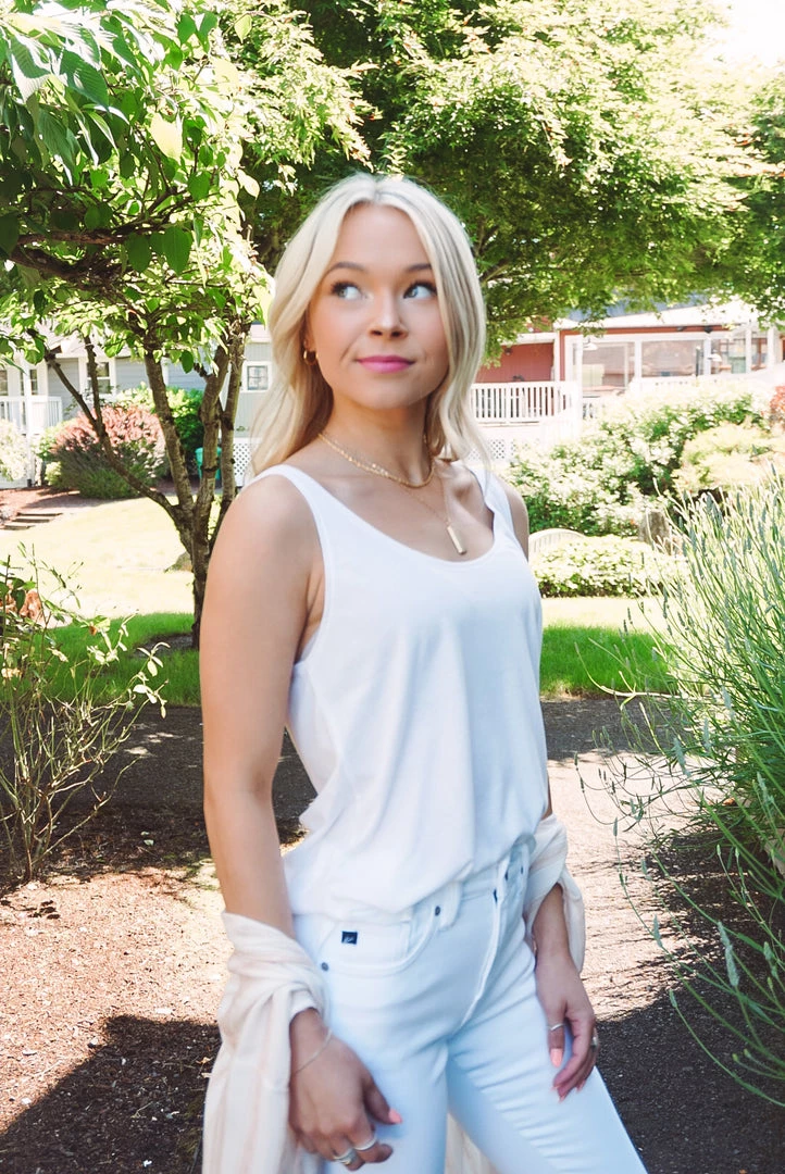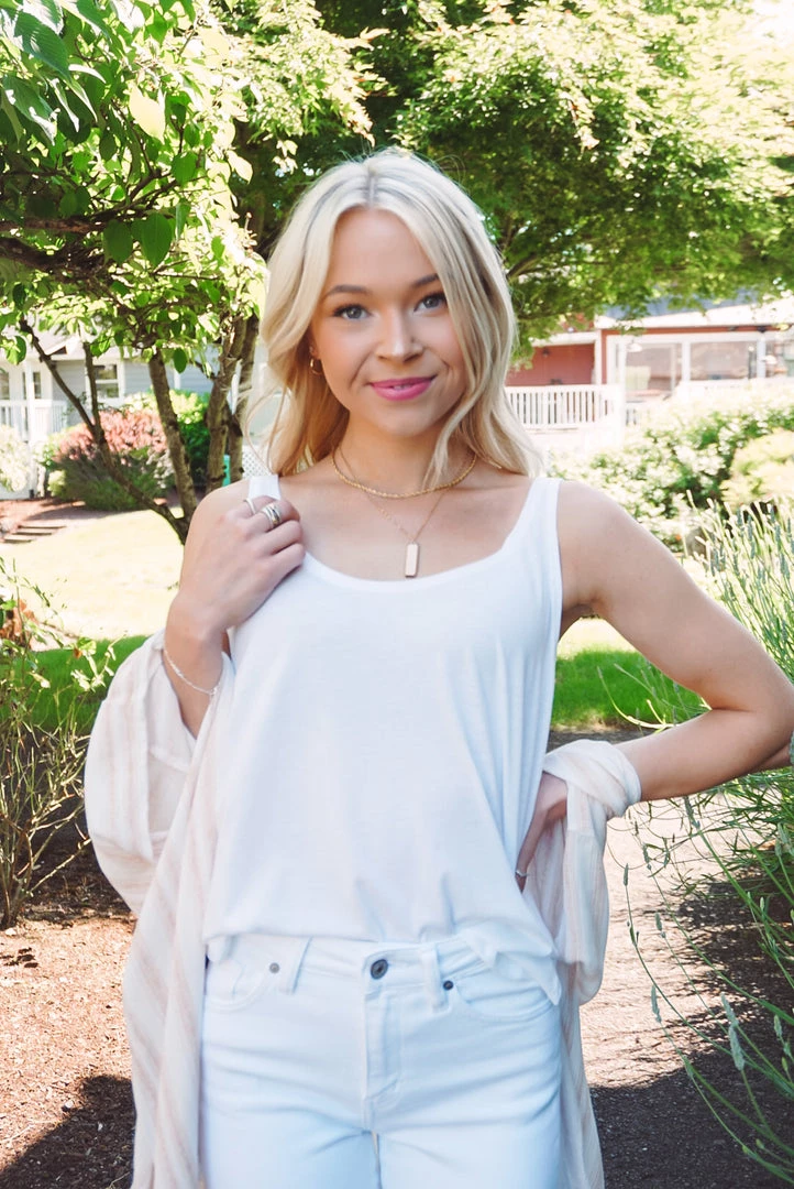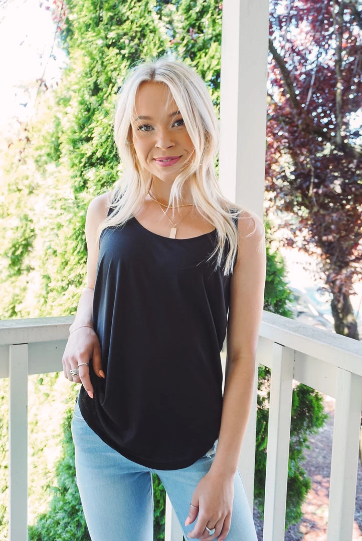 Simple yet such a staple! A lightweight tank featuring a scoop neckline, curved hem, sleeveless style, and a relaxed fit. Perfect for layering or wearing by itself! Available in black & white.