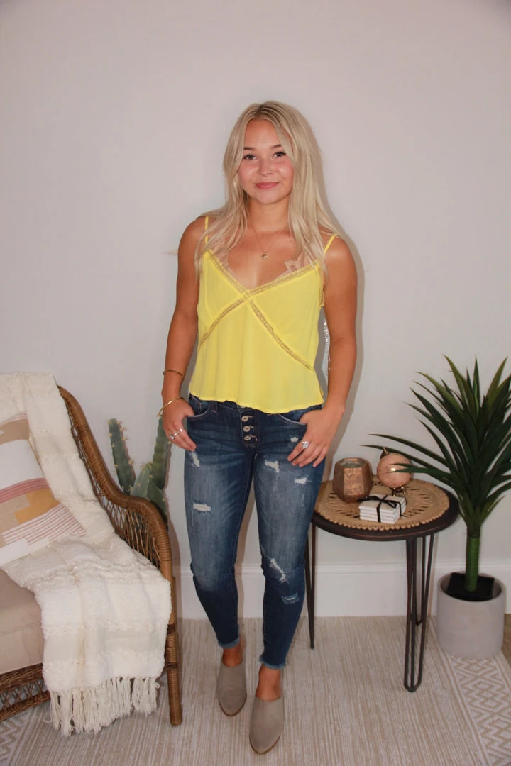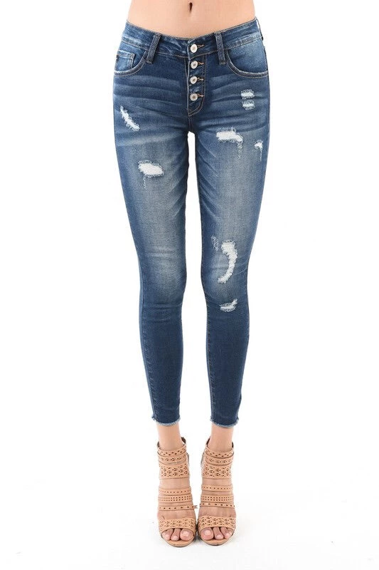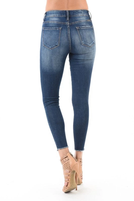 Super stretchy ankle skinny jean with distressing and raw hem. Button fly denim in medium wash.