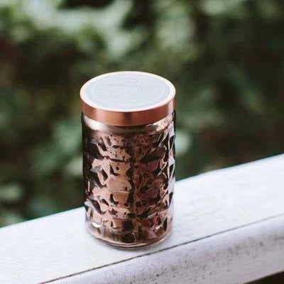 Warm, copper tones glow from 103’s beveled glass votive design. Burn Time 25-30 hours Content/Weight 4.4oz/126grams
