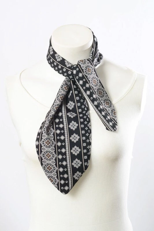 Class up any outfit with this adorably printed, satin scarf. This bandana being shorter and slimmer than normal makes it extremely easy to style in your hair, around your neck, or on your bag. The neutral colors make it an easy addition to any outfit.