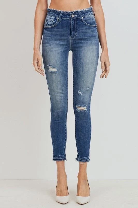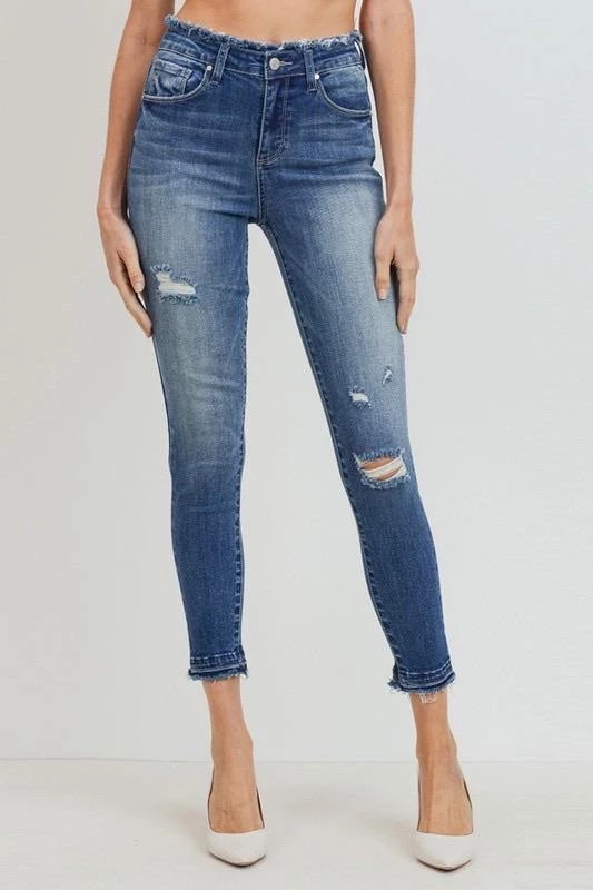 These lightly distressed skinny jeans are so cute. Mid wash with frayed waistband detailing and a raw hem. Ankle length with zip up enclosure.