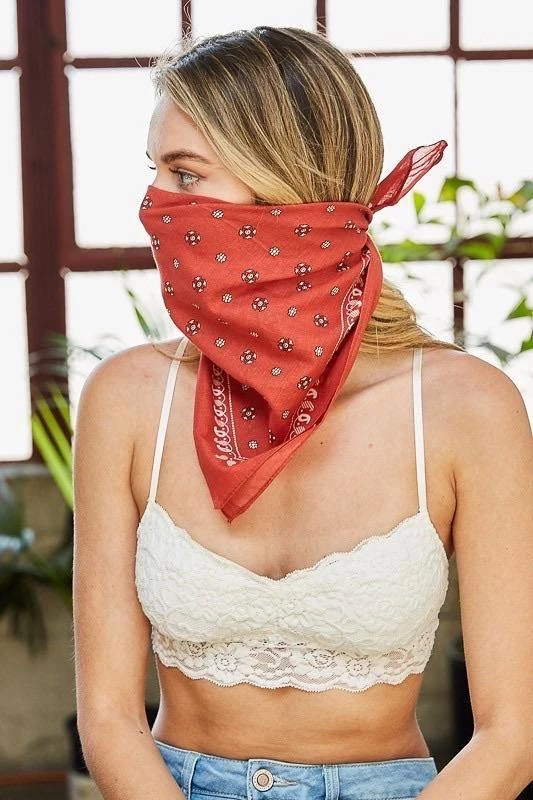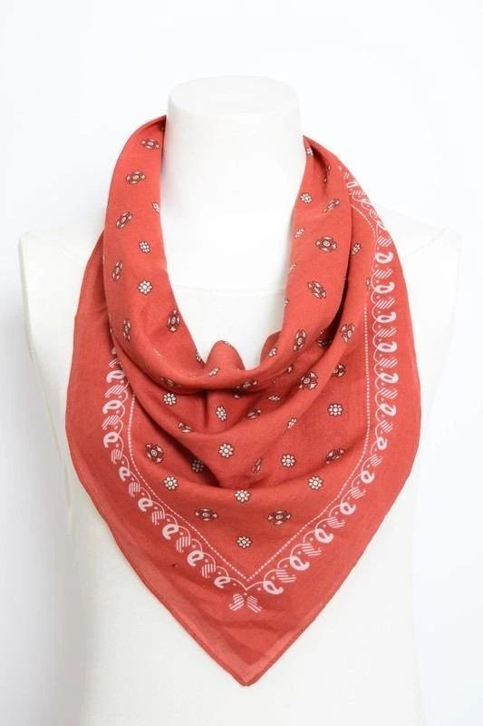 This paisley bandana is so pretty. Rust color with western paisley design. This scarf works as a face covering, hair piece, scarf for your neck, belt, etc. The options are endless with these little accessory pieces.
