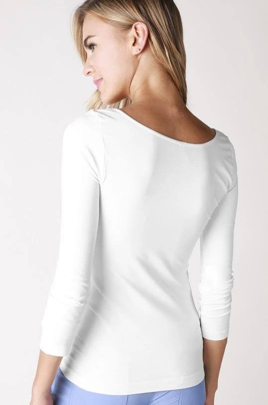 This seamless basic layer is a closet necessity! Great for layering under just about anything, this top features a seamless body, scoop neckline, soft & stretchy fabric, 3/4 length sleeves, and a great fit!