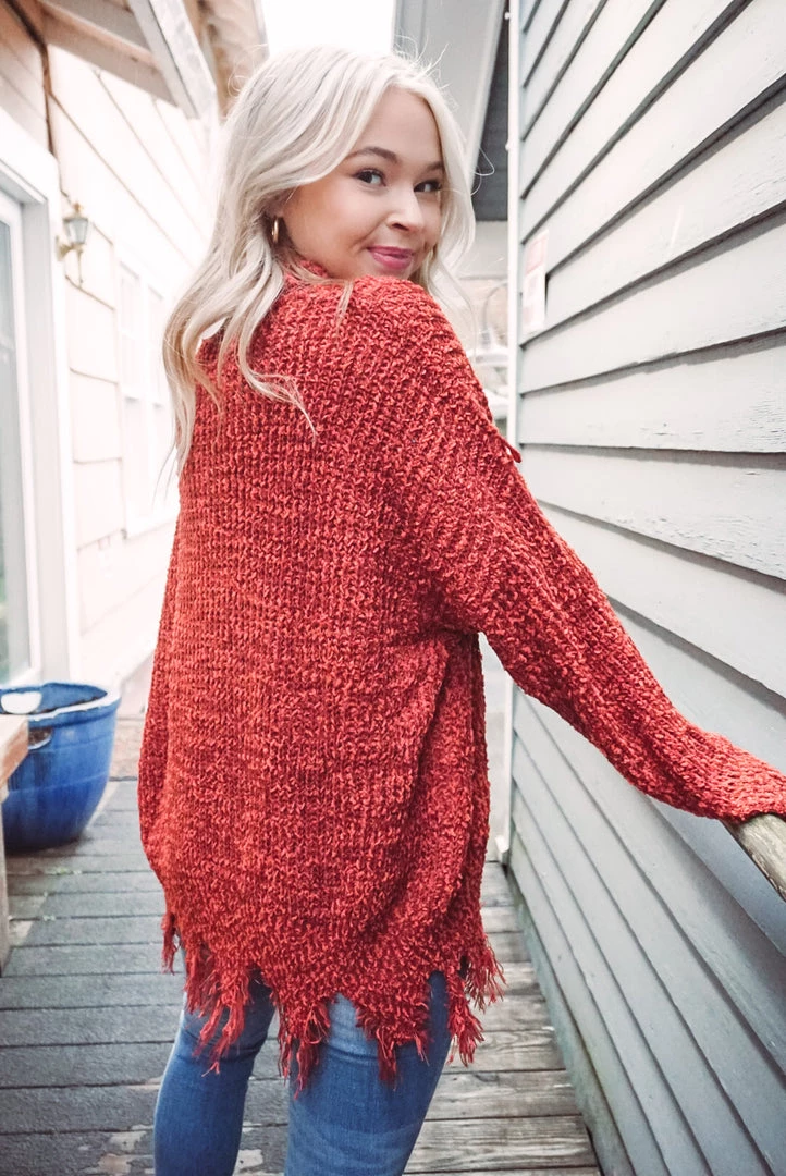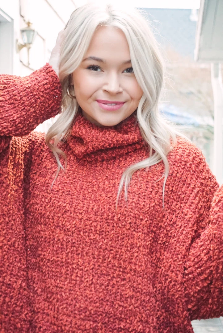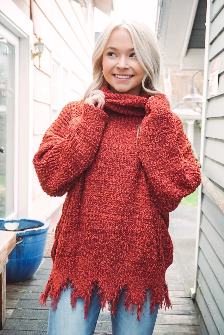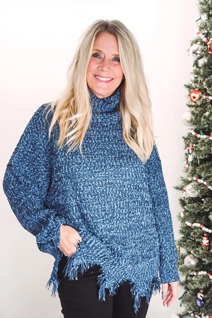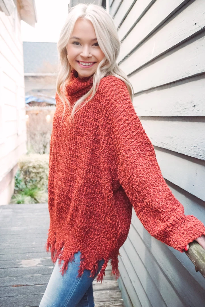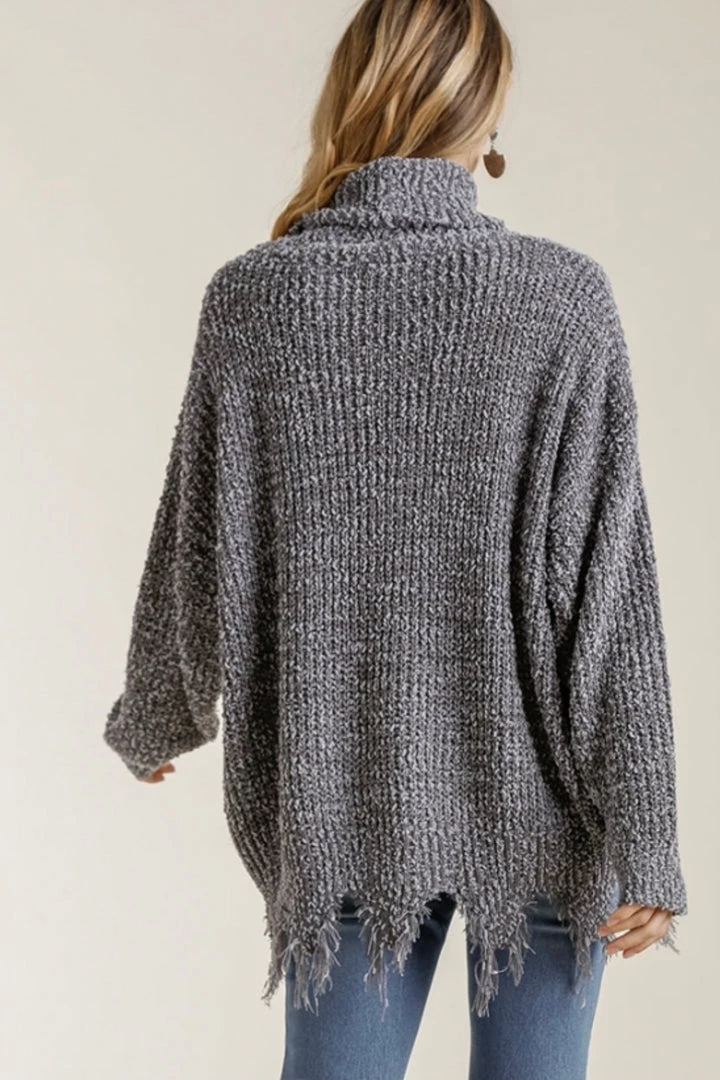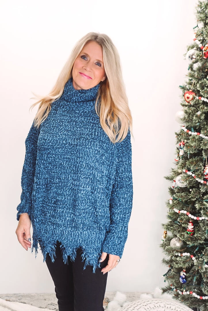This turtleneck sweater is absolutely adorable! Featuring a soft chenille fabric, frayed hem detailing, turtle neckline, long sleeves, and an oversized fit. Pair with denim or leggings for an effortless wear yet stunning style!