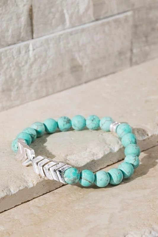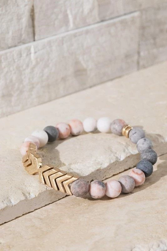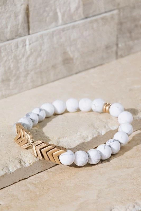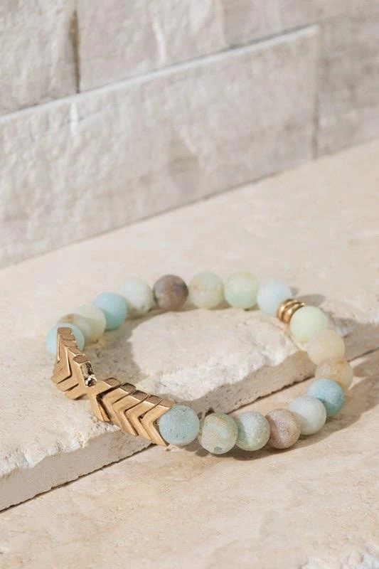 Accessorize any outfit with this darling bracelet! Available in 5 colors featuring stylish natural stones with metal chevron pendant in a stretch bracelet style.
