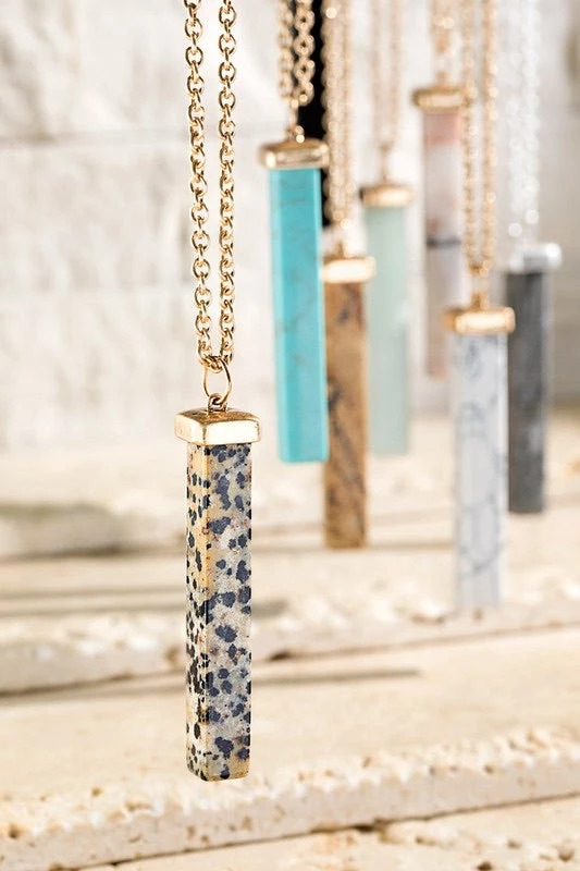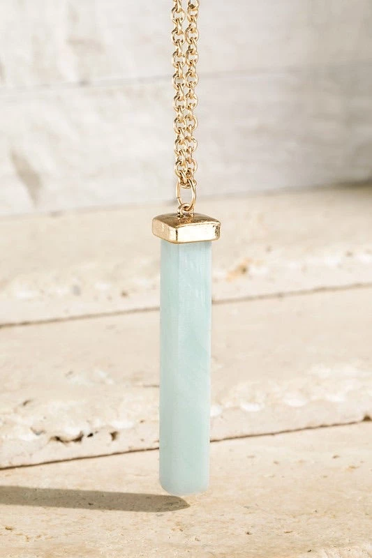 This gorgeous pendant is available in a beautiful amazonite stone color. Featuring a semi-precious stone bar pendant with lobster closure in a long necklace style.