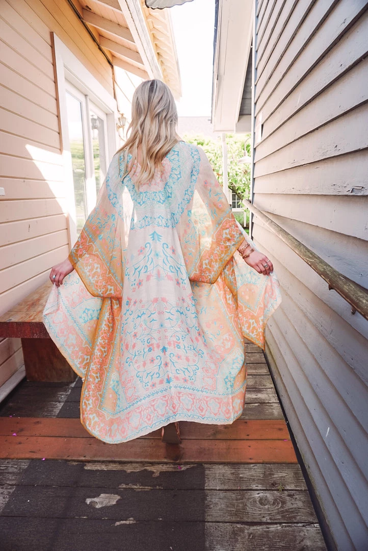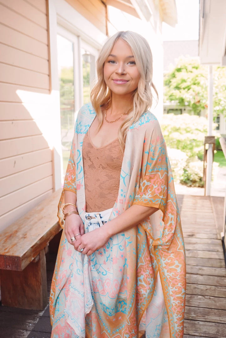 Add some color to your wardrobe with this stunning kimono! The Amelia Kimono features an open front design, gorgeous mandala print with contrasting ombré effect, side slits, and a one size fit. Pair this kimono with any neutral outfit for a pop of color & effortless wear!