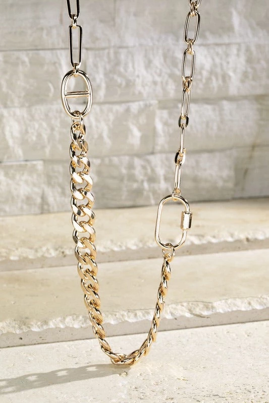 Dazzling mixed trace, curb and a linked short metal chain necklace with a toggle closure. Available in a gold finish.