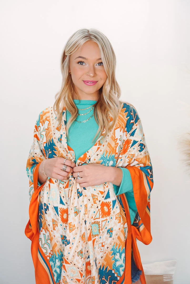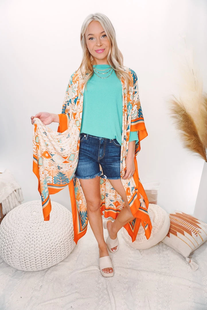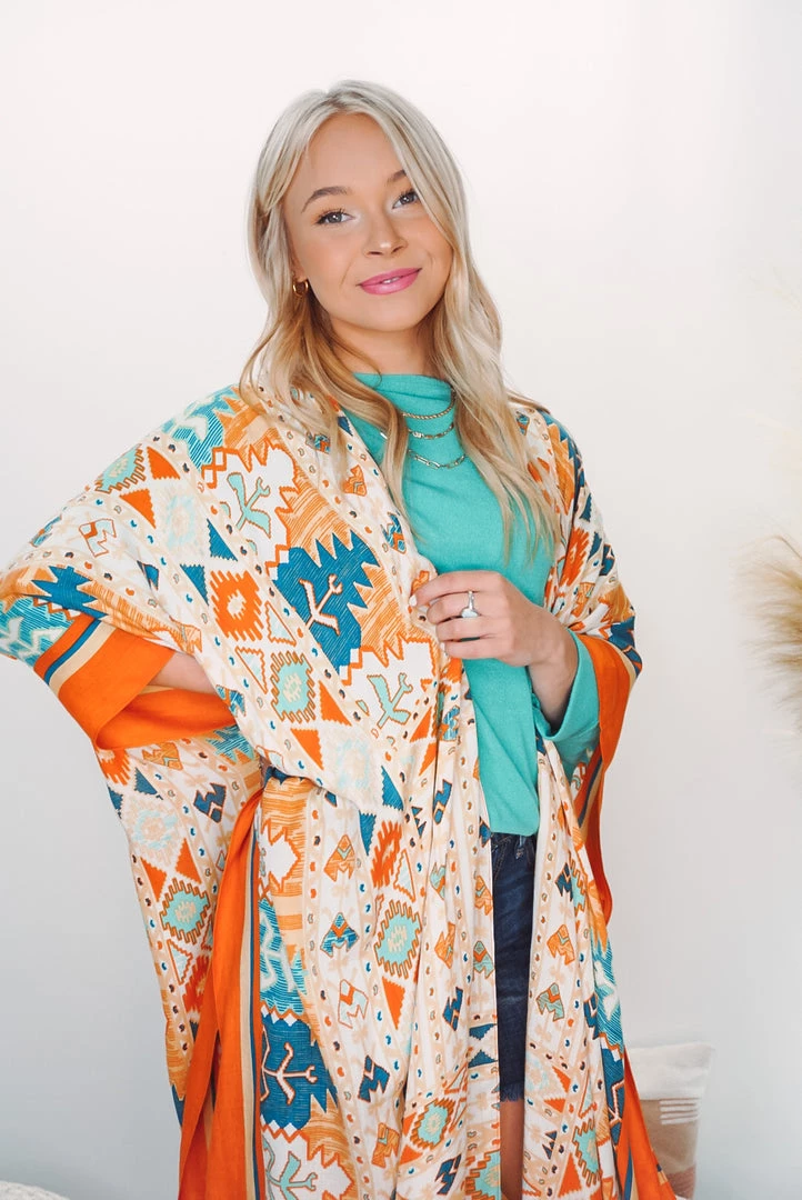 An ethnic flare & an effortless wear! This kimono features a stunning ethnic print with border detailing, side slits, open front design, long line silhouette, and a relaxed-loose fit. Throw on over your favorite tank or wear styled as a swim cover-up!