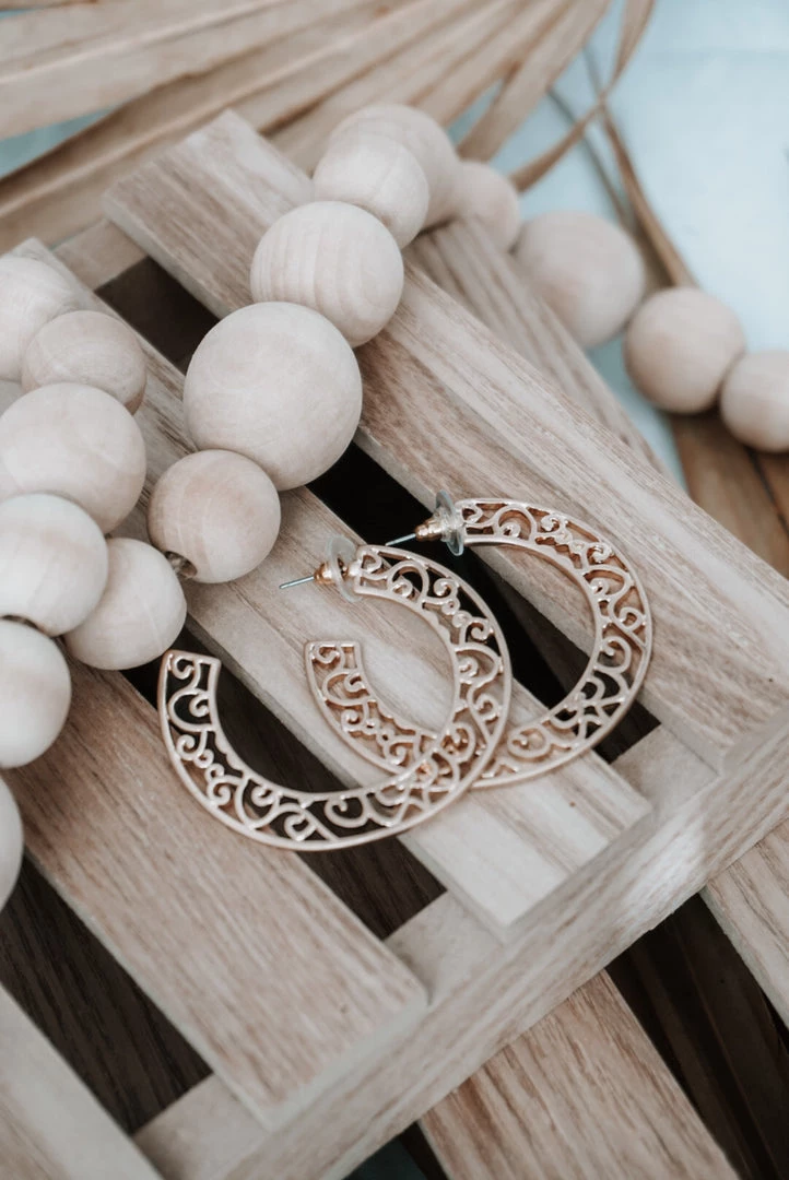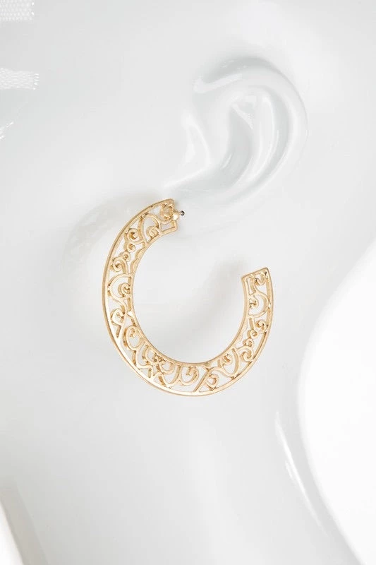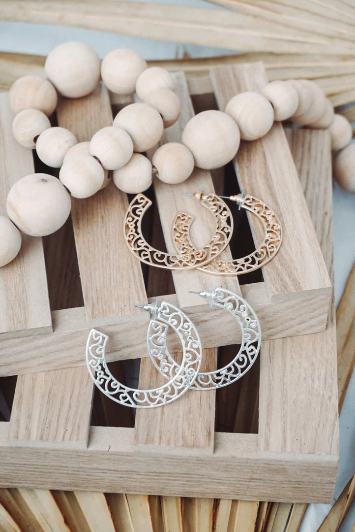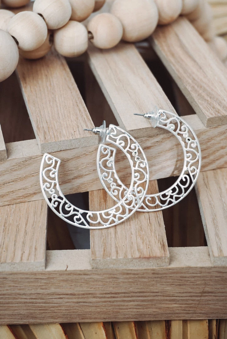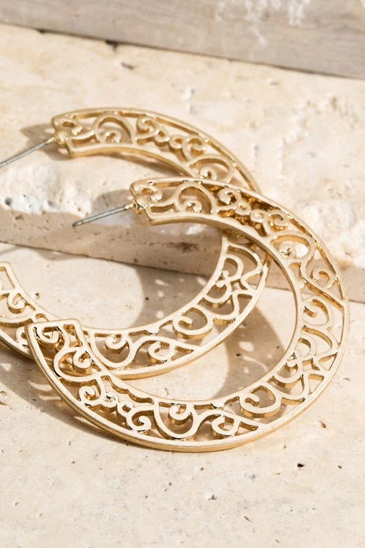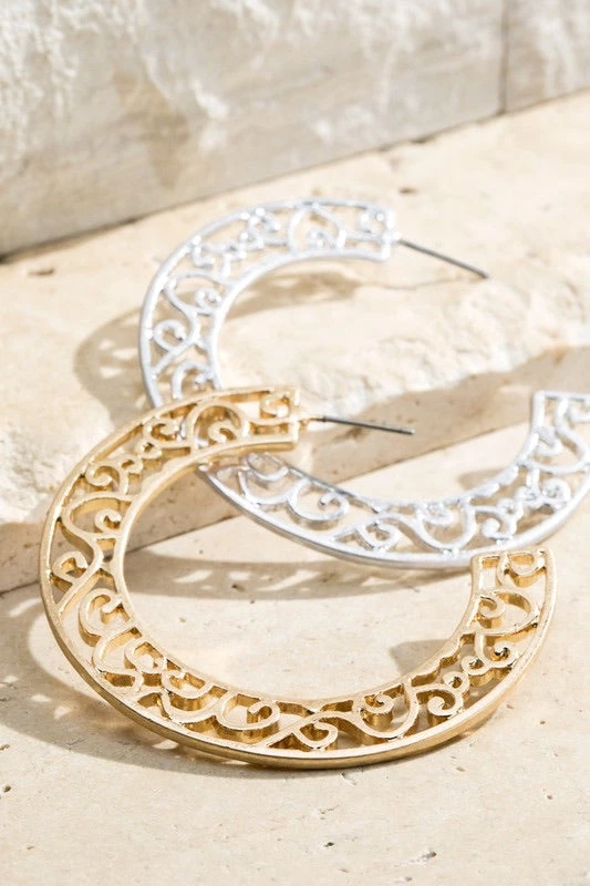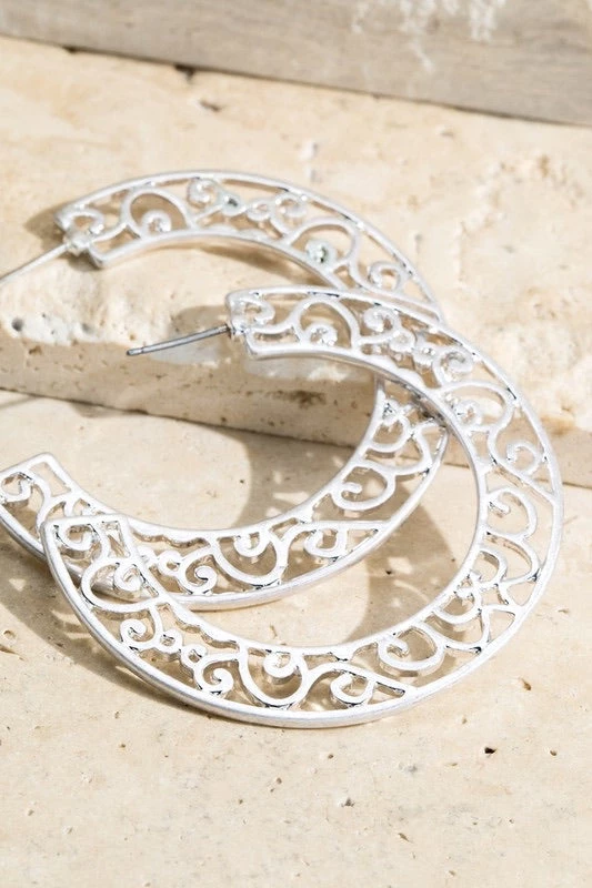 These metal hoop earrings feature an intricate filigree design in a larger hoop style with post backing. This accessory can add the perfect touch to any outfit.