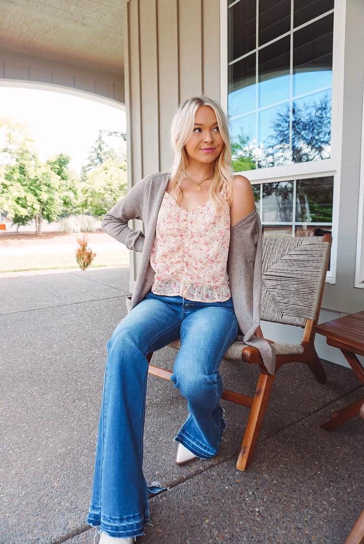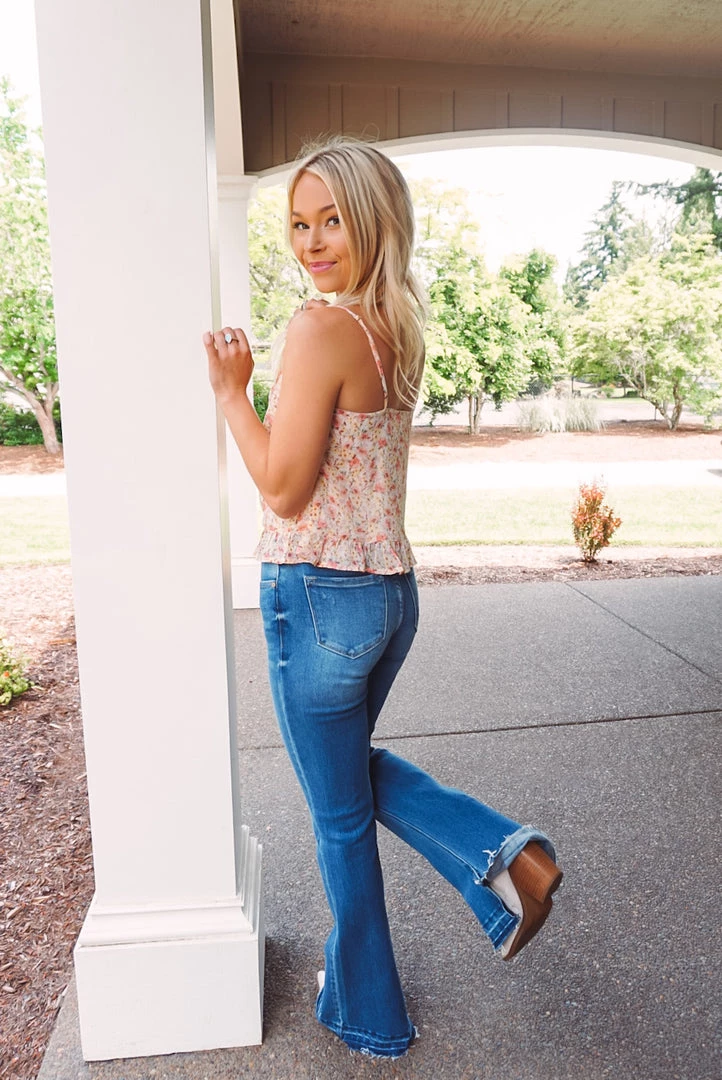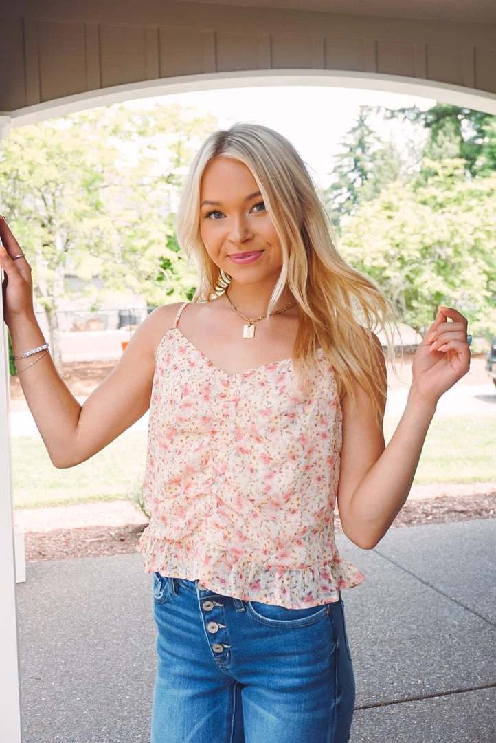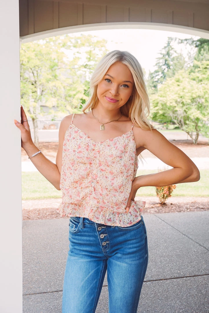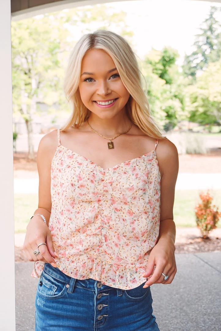 A cute little floral cami that can be worn by itself or styled as a mid-layer. Featuring a dainty floral print, ruched front detailing, adjustable cami straps, v neckline, and a ruffled hem. Pair with your favorite pants or denim for a easy-to-wear style & perfect summer look!