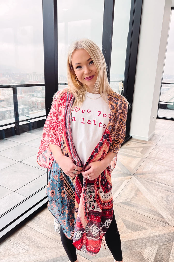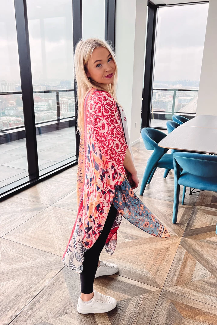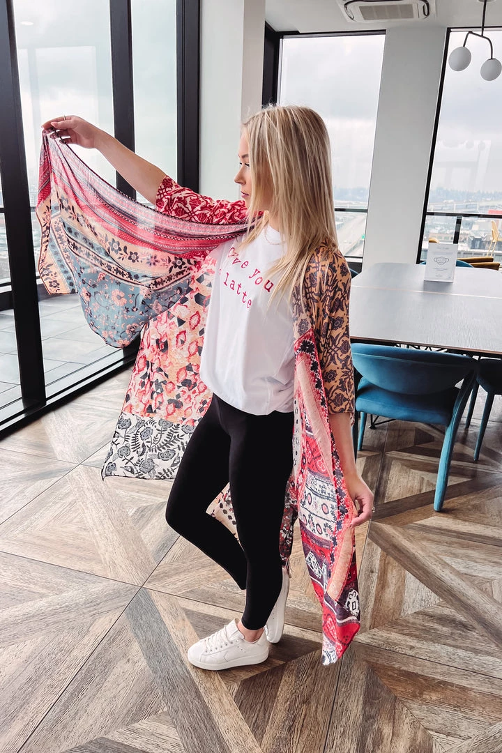 The perfect transitional piece! This colorful kimono features a floral tile print, open front design, side slits, one size fit, and a long line silhouette. Pair with denim or leggings over your favorite tee for a comfortable yet stylish look!