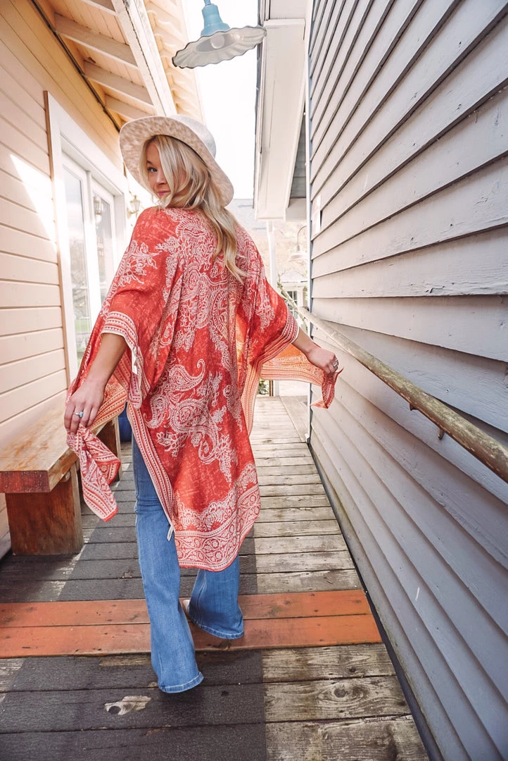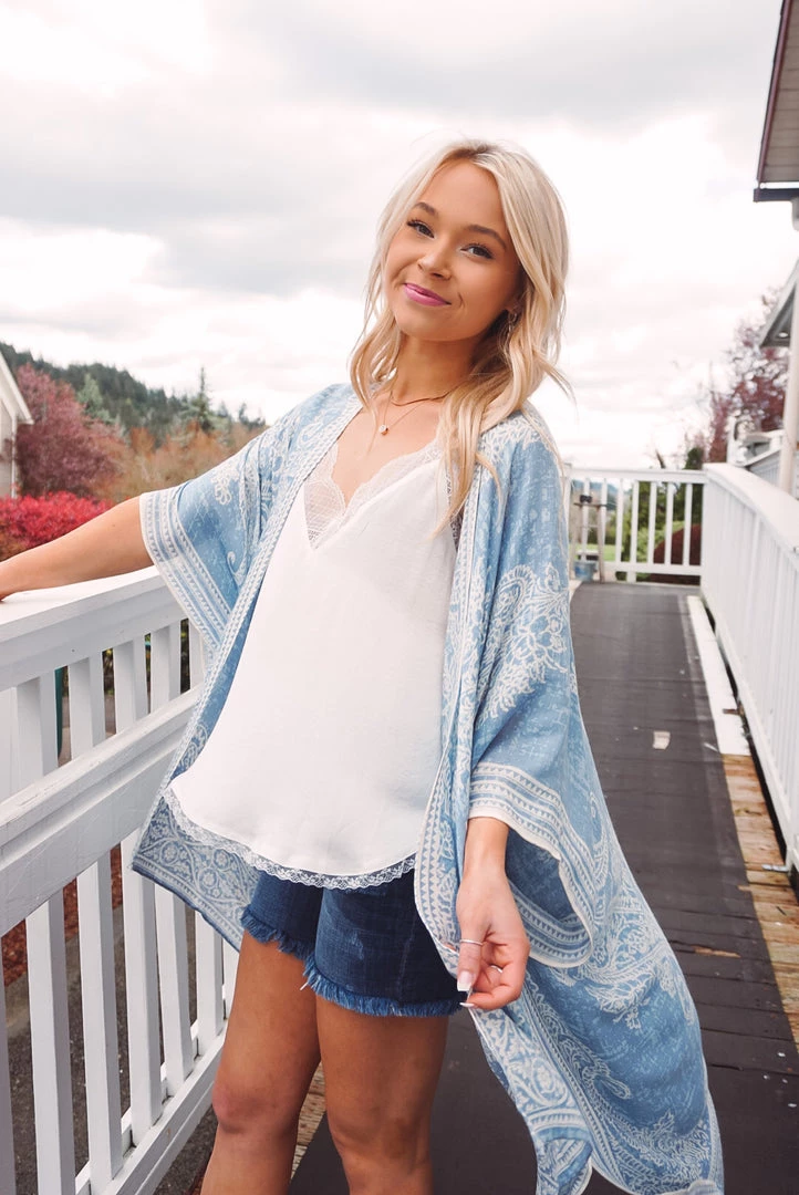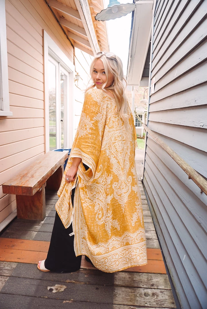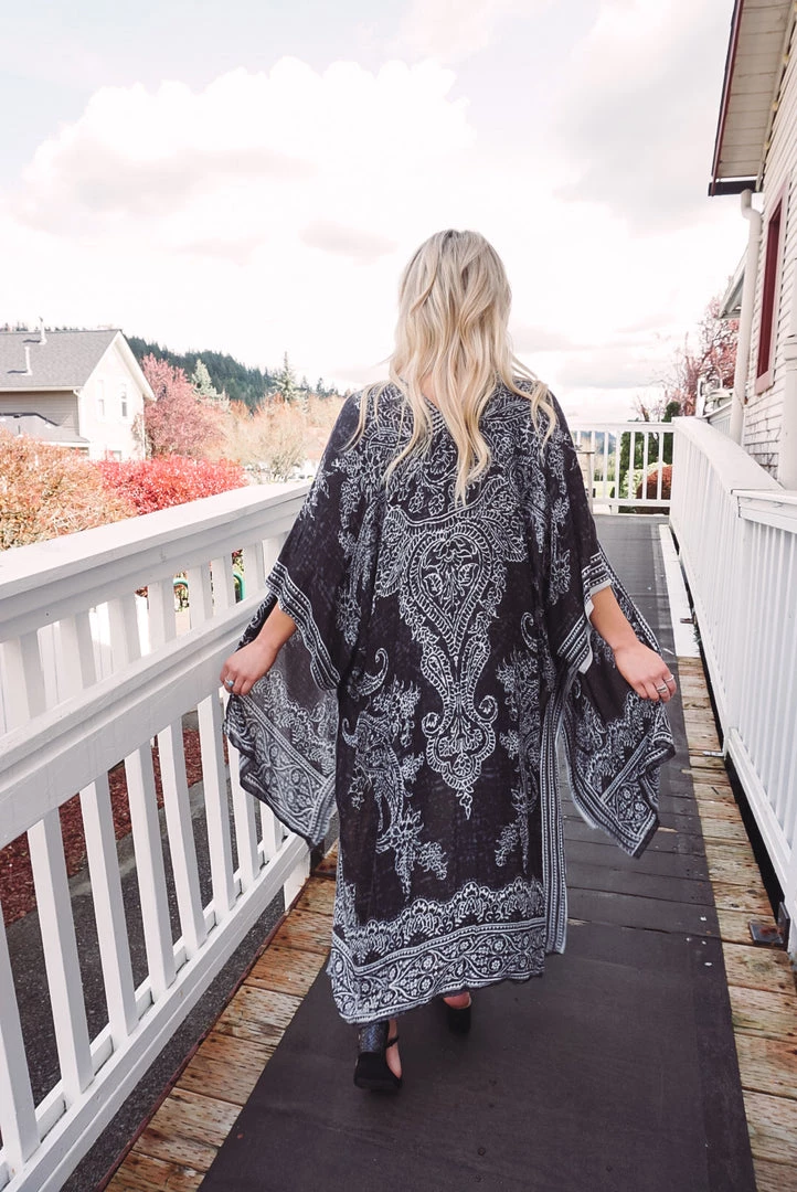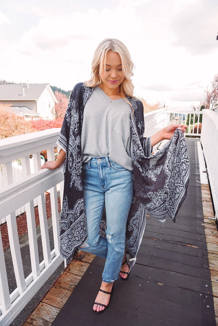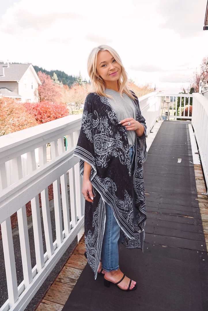 Simple yet so elegant! This kimono features a stunning damask & paisley print, side slits, border detailing, open front design, and a one size flowy fit. Available in 4 colors, this kimono can be layered over just about anything to elevate your look!