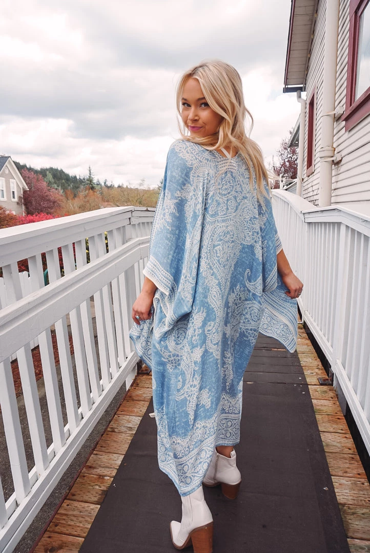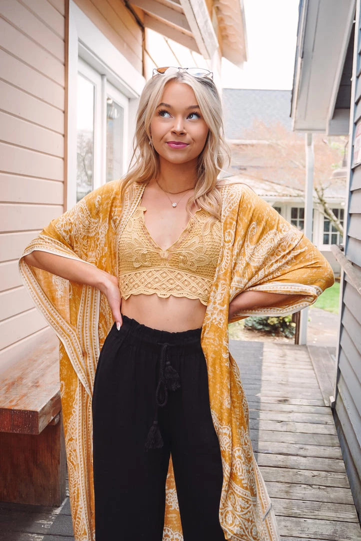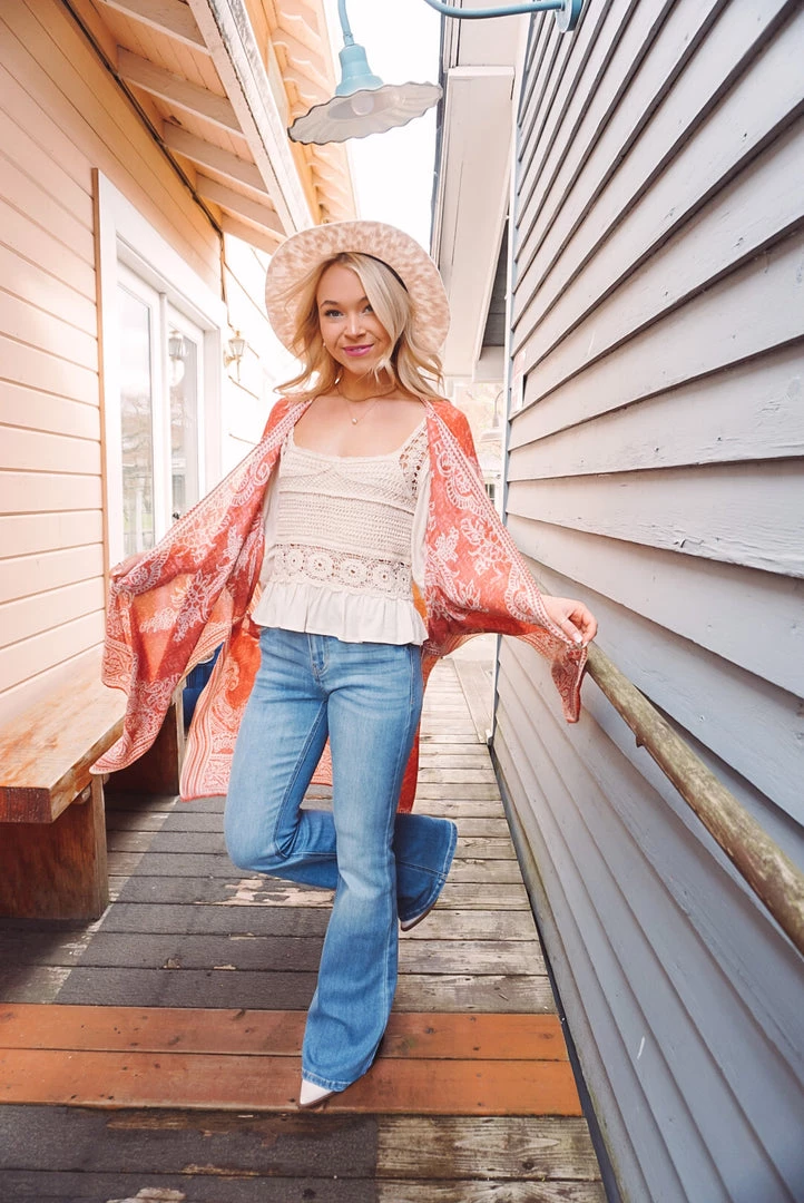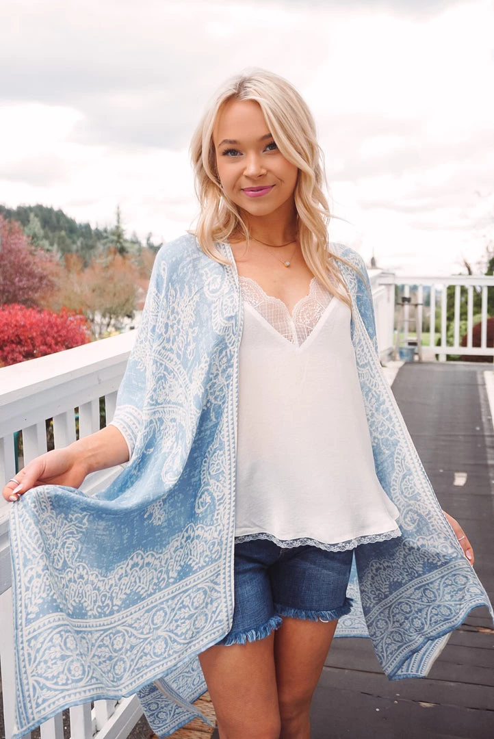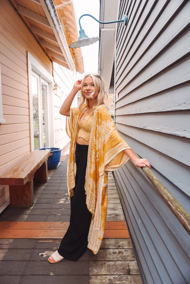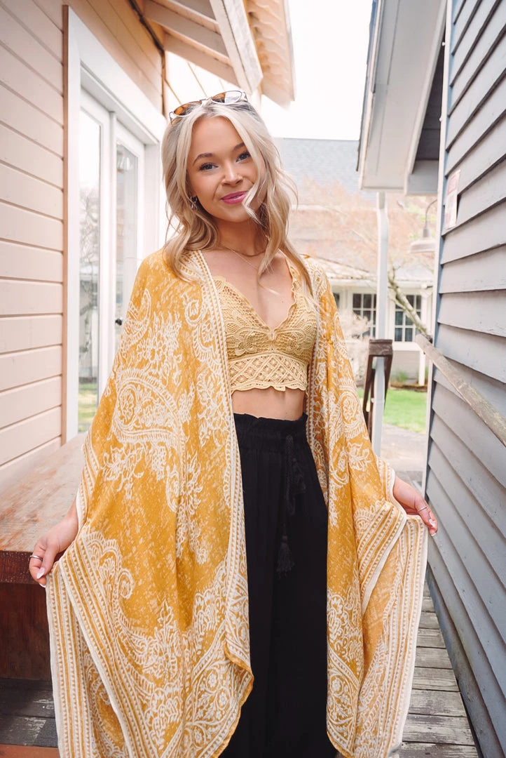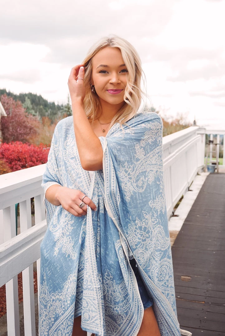 Simple yet so elegant! This kimono features a stunning damask & paisley print, side slits, border detailing, open front design, and a one size flowy fit. Available in 4 colors, this kimono can be layered over just about anything to elevate your look!