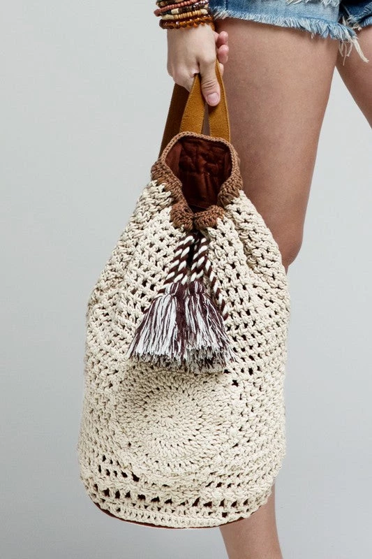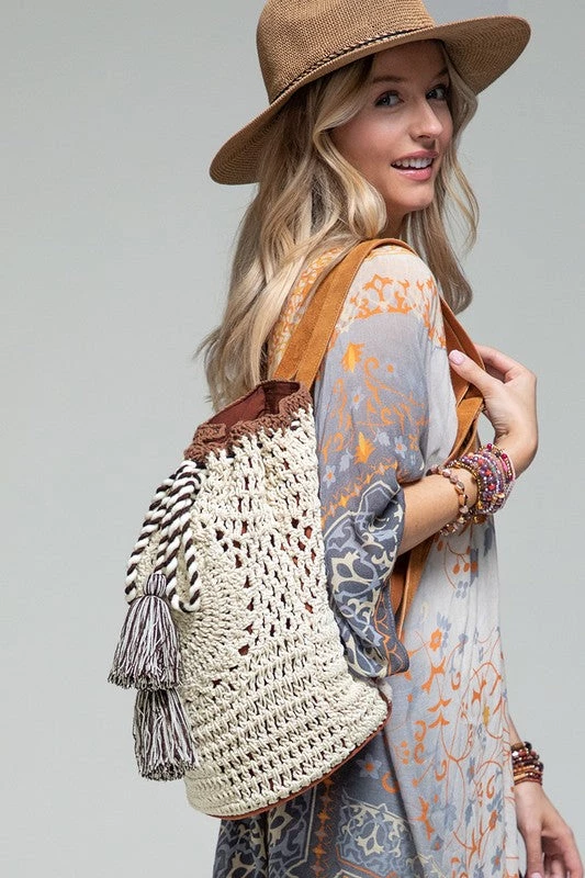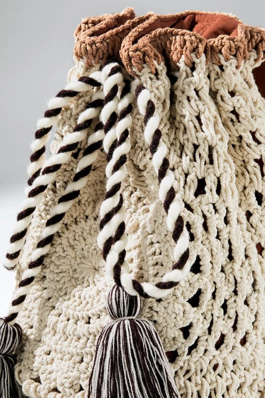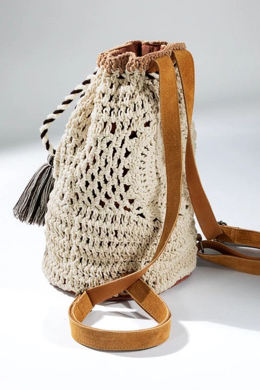 The perfect accessory for your next outing! This handmade crochet backpack features 2 inner slip pockets and 1 inner zipper pocket with genuine suede adjustable straps finished off with a draw string with tassel closure.