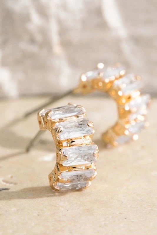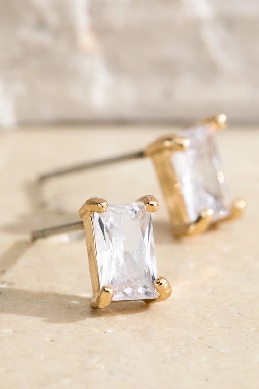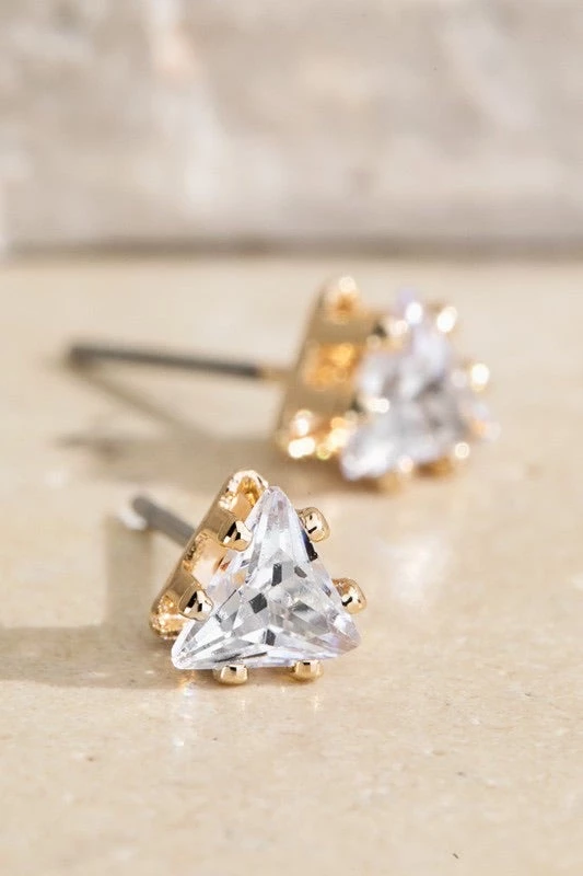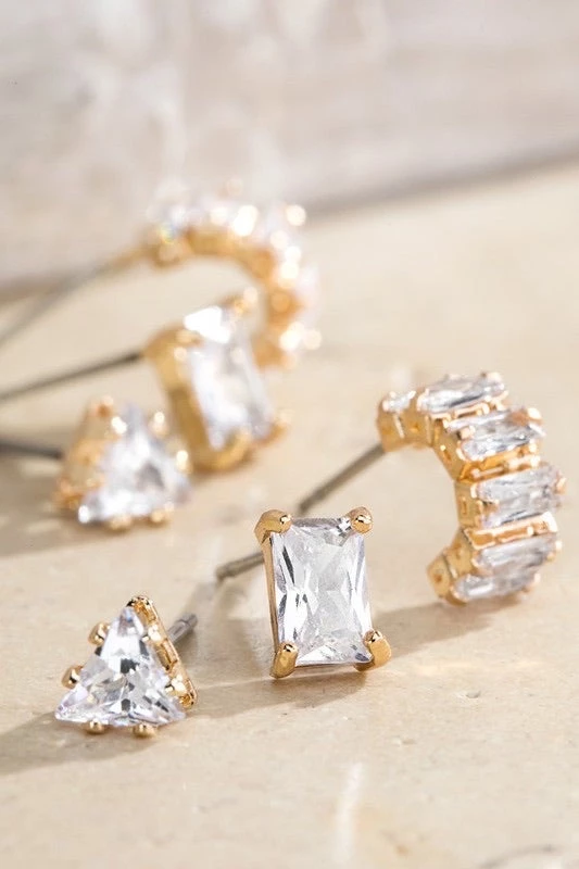 We love this cute everyday earring set! This style includes a set of 3 cubic zirconia triangle and rectangle shape stud plus a set of huggie hoop earrings.