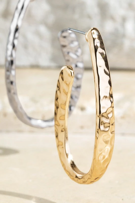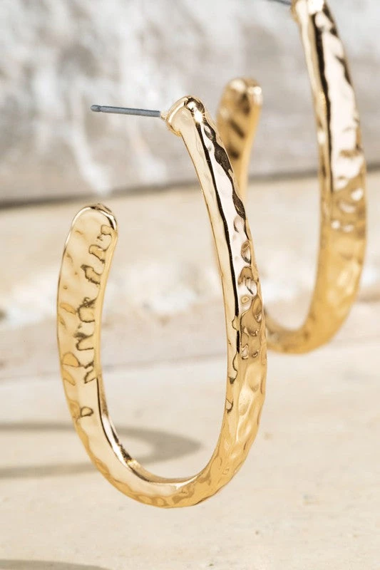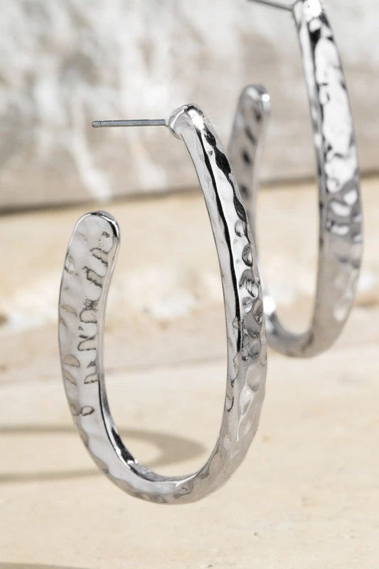 These beautiful glossy hoops feature a hammered metal and a lightweight feel. Add a simple touch to any outfit with these earrings!