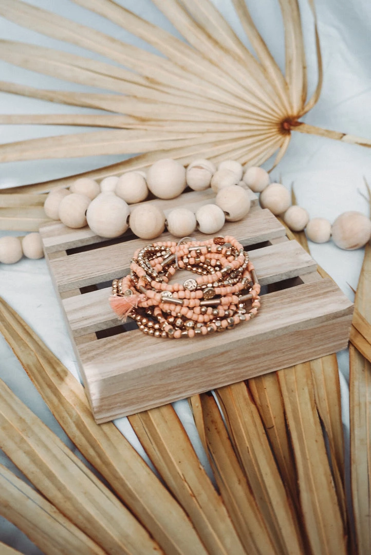 Available in a white & a peach color, this bracelet stack is such a cute accent to any outfit. This multi layered 12 strand bracelet features gold-tone beads, glass beads and tassel accent.