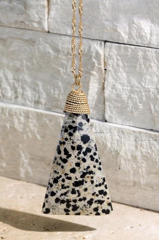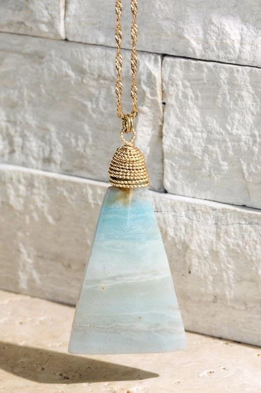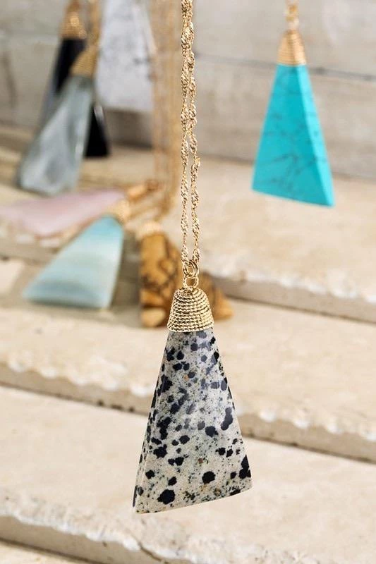 Triangle shape natural stone with a wire top cap pendant and metal long chain with a lobster claw claps closure necklace.