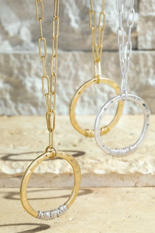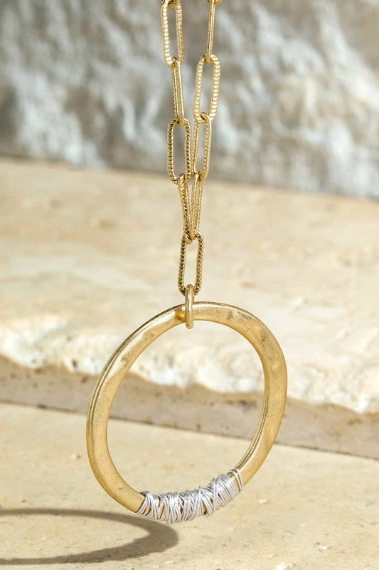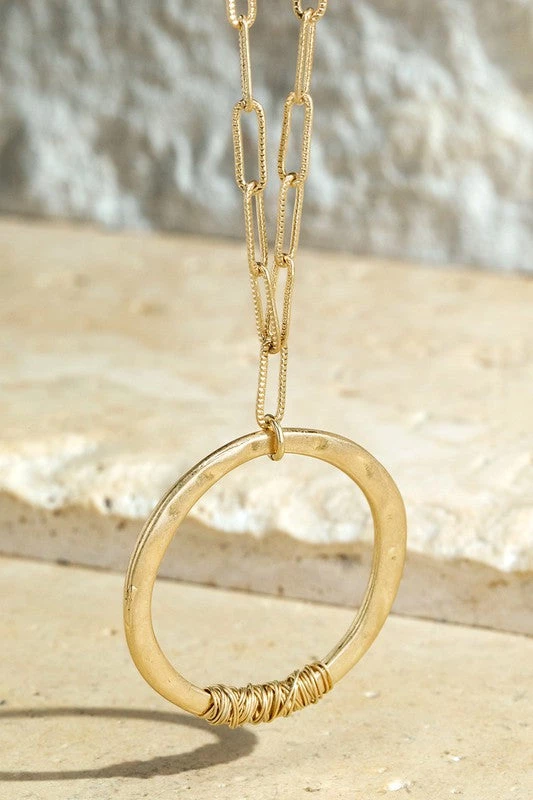 Add a simple touch with the Wrapped Up Pendant Necklace. Featuring a worn hammered texture with metal wire wrap on a circle pendant and a short linked chain.