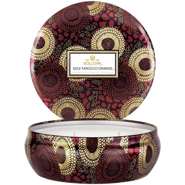 Rich jewel tones adorn this beautifully patterned metallic option, with fragrance wafting from each of its three wicks. The ornate tin features Japanese-inspired art and includes a lid, perfect for keepsakes once it has finished burning.